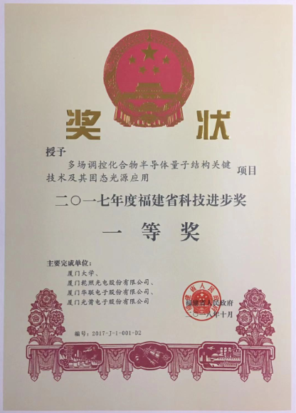 八、10月31日,福建省人民政府發(fā)文公布《2017年度福建省科學(xué)技術(shù)獎(jiǎng)勵(lì)和專利獎(jiǎng)勵(lì)的決定》。乾照光電與廈門大學(xué)、廈門華聯(lián)電子股份有限公司、廈門光莆電子股份有限公司聯(lián)合申報(bào)的“多場調(diào)控化合物半導(dǎo)體量子結(jié)構(gòu)關(guān)鍵技術(shù)及其固態(tài)光源應(yīng)用”從454項(xiàng)科技進(jìn)步獎(jiǎng)項(xiàng)目中脫穎而出,榮獲福建省科技進(jìn)步獎(jiǎng)一等獎(jiǎng)。