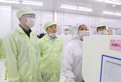 隨后,考察組一行參觀了生產(chǎn)車(chē)間,重點(diǎn)觀摩了芯片工藝流程和點(diǎn)測(cè)工藝,對(duì)現(xiàn)代化的生產(chǎn)技術(shù)頻頻稱贊。得知外延生產(chǎn)車(chē)間中運(yùn)作良好的MOCVD設(shè)備均為南昌當(dāng)?shù)仄髽I(yè)生產(chǎn)制造時(shí),盛煒書(shū)記對(duì)乾照光電對(duì)南昌光電產(chǎn)業(yè)發(fā)展的支持表示了贊許。