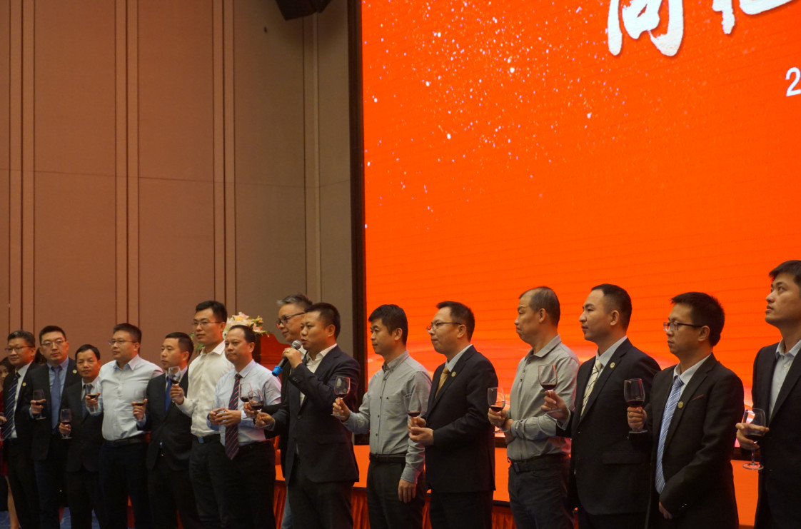 領(lǐng)導(dǎo)致辭后,晚宴正式開始。金章育董事長和嘉賓一起,攜公司高管上臺致祝酒詞。今夜,我們共同舉杯,敬過往,也敬未來!