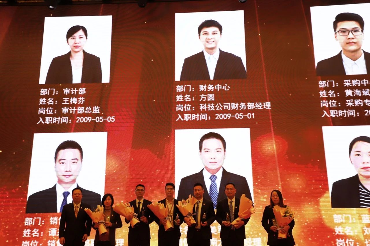 總結(jié)報告后,公司對2019年工作中表現(xiàn)突出的個人和團隊進行了表彰。此次表彰共設(shè)置了最佳新人獎、基層骨干獎,技術(shù)精英獎、管理卓越獎、優(yōu)秀部門獎、優(yōu)秀班組獎、科技進步獎、十年員工、黨支部優(yōu)秀黨員獎、“乾照十佳人物”等十大獎項,共計79人獲個人獎項,12個團隊獲團體獎項。按照往年慣例,“乾照十佳人物”的頒獎環(huán)節(jié)由董事長金章育親自主持并為獲獎人員一一頒獎,總裁蔡海防為十年員工頒發(fā)十年紀念金幣。