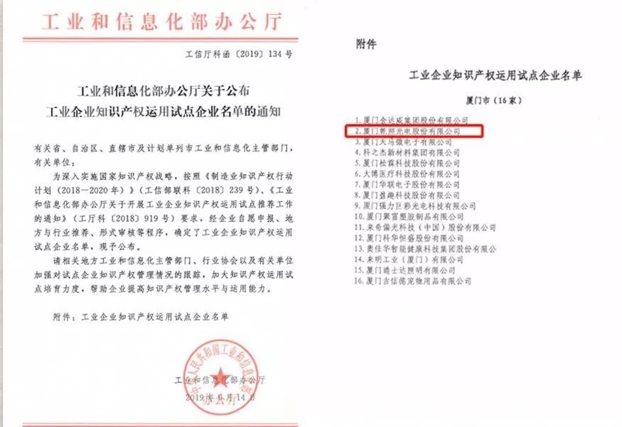 入選國家工業(yè)和信息化部公布的“工業(yè)企業(yè)知識產(chǎn)權運用試點企業(yè)名單”