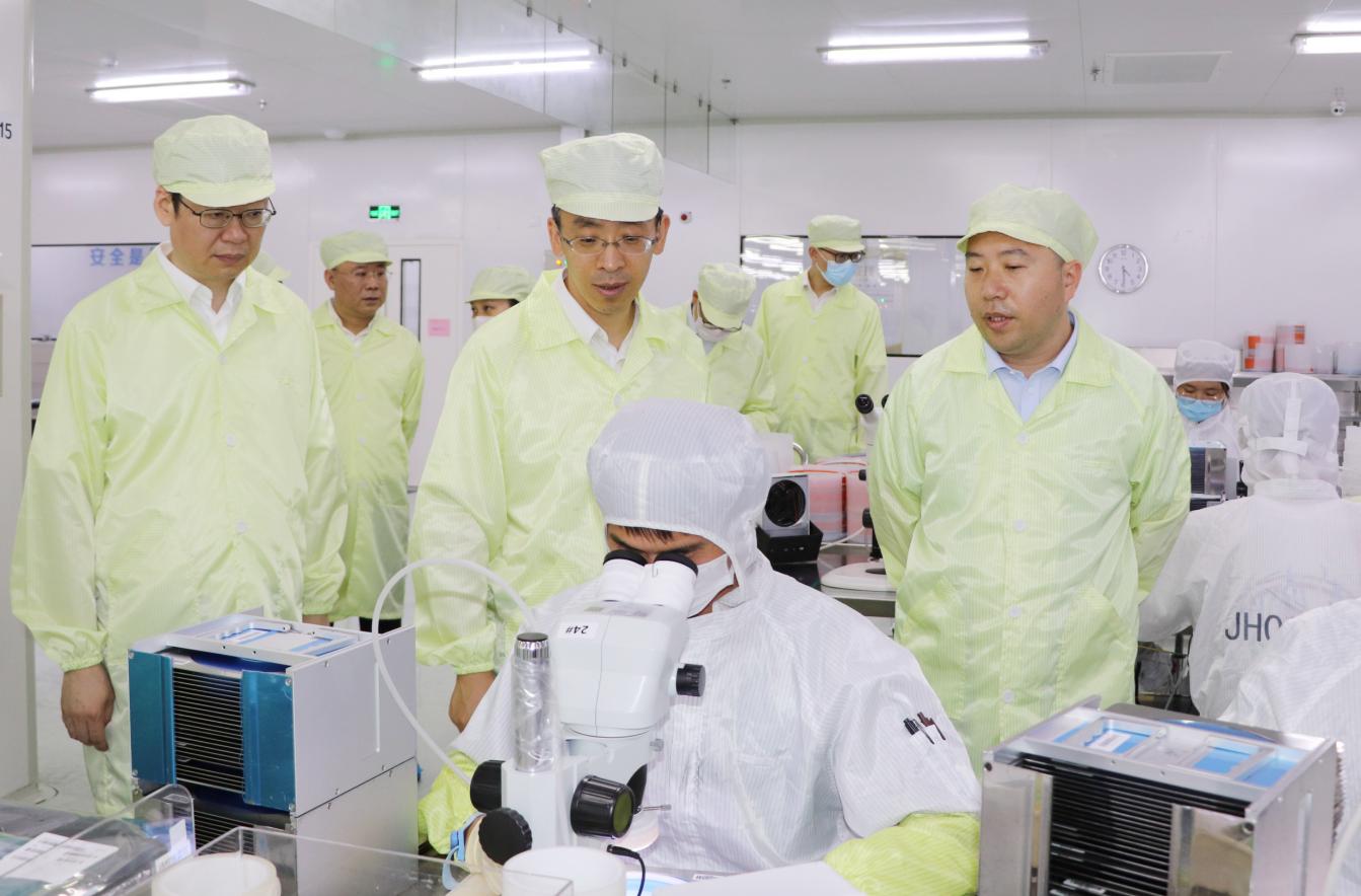 在公司展廳,王市長一行聽取了劉兆關(guān)于乾照光電發(fā)展歷程、主營產(chǎn)品及未來發(fā)展的匯報(bào)。王市長邊看邊問,圍繞技術(shù)、創(chuàng)新、發(fā)展等方面與劉兆深入探討,詳細(xì)了解了公司的運(yùn)營情況。隨后王市長一行前往外延片、芯片的生產(chǎn)車間,參觀車間生產(chǎn)環(huán)境,認(rèn)真觀摩了外延片生產(chǎn)技術(shù)工藝和芯片點(diǎn)測、分選以及目檢等車間生產(chǎn)流程。