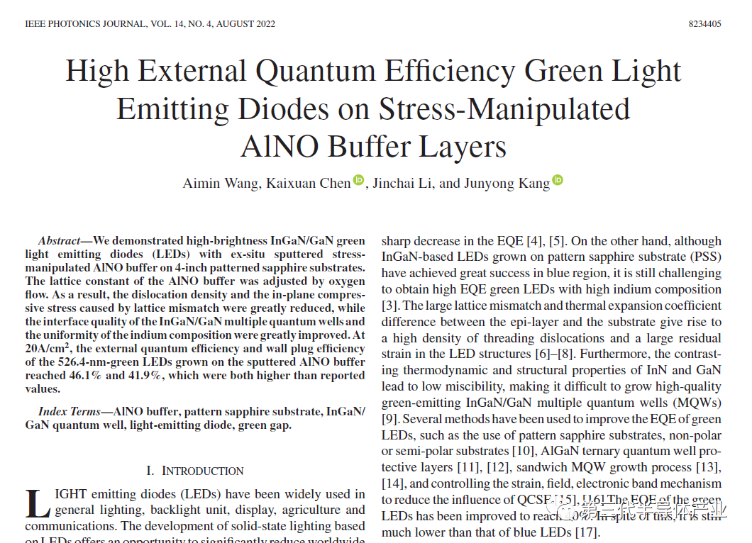 近日,廈門(mén)大學(xué)物理科學(xué)與技術(shù)學(xué)院與乾照光電協(xié)同攻關(guān),在提升綠光LED效率方面取得重大進(jìn)展。該研究成果以“High External Quantum Efficiency Green Light Emitting Diodes on Stress-Manipulated AlNO Buffer Layers”為題發(fā)表于IEEE PHOTonICS JOURNAL 14(4) (2022) 8234405。