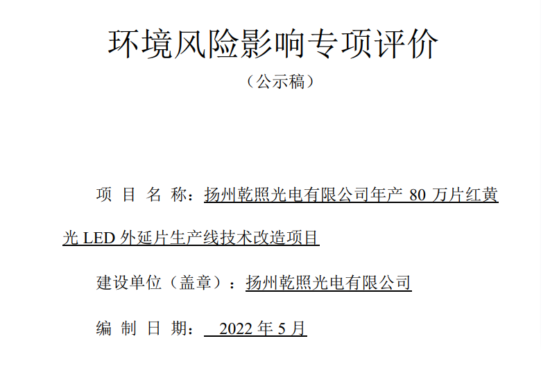 揚(yáng)州乾照光電有限公司年產(chǎn)80萬片紅黃光LED外延片生產(chǎn)線技術(shù)改造項(xiàng)目環(huán)境風(fēng)險(xiǎn)影響專項(xiàng)評(píng)價(jià)公示稿