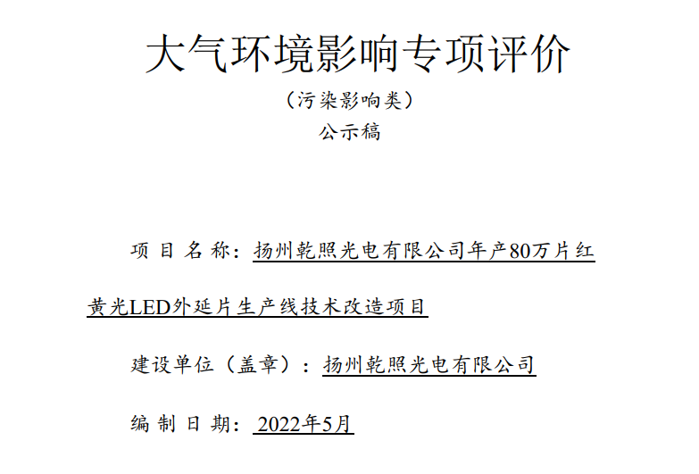 揚(yáng)州乾照光電有限公司年產(chǎn)80萬片紅黃光LED外延片生產(chǎn)線技術(shù)改造項(xiàng)目大氣環(huán)境影響專項(xiàng)評(píng)價(jià)公示稿