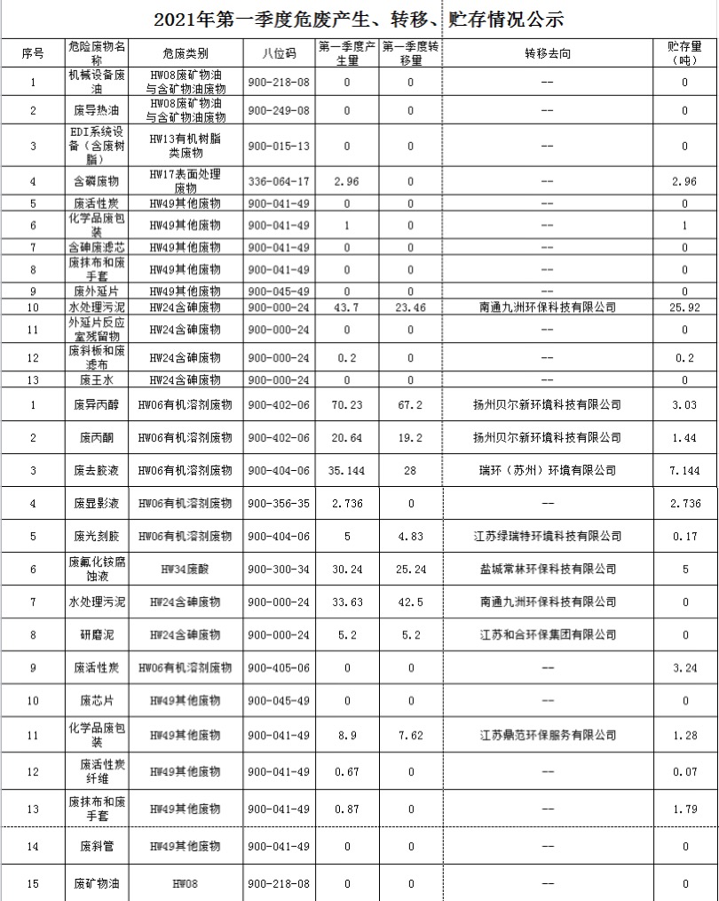 揚(yáng)州乾照光電有限公司2021年第一季度危廢產(chǎn)生、轉(zhuǎn)移、貯存情況公示