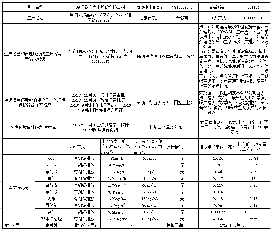 廈門(mén)乾照光電股份有限公司環(huán)境信息表