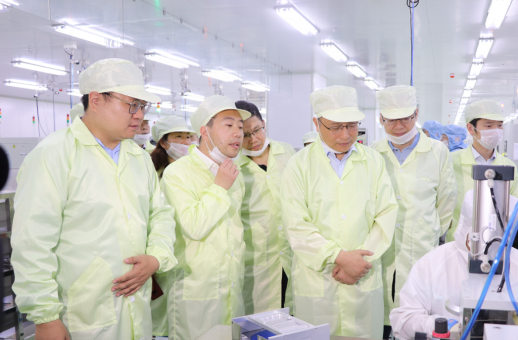 6月3日,南昌市委常委、常務(wù)副市長肖玉文,市政府副秘書長、辦公廳主任王耀,新建區(qū)政府、市金融辦、市工信局、市工業(yè)控股主要領(lǐng)導(dǎo),以及中國銀行南昌分行、中國建設(shè)銀行南昌分行、中國農(nóng)業(yè)銀行南昌分行、北京銀行南昌分行、江西銀行南昌分行等相關(guān)負(fù)責(zé)人,蒞臨江西乾照光電調(diào)研指導(dǎo)工作。乾照光電董事長金章育,副總裁嚴(yán)希闊,江西乾照光電總經(jīng)理劉兆等陪同接待。