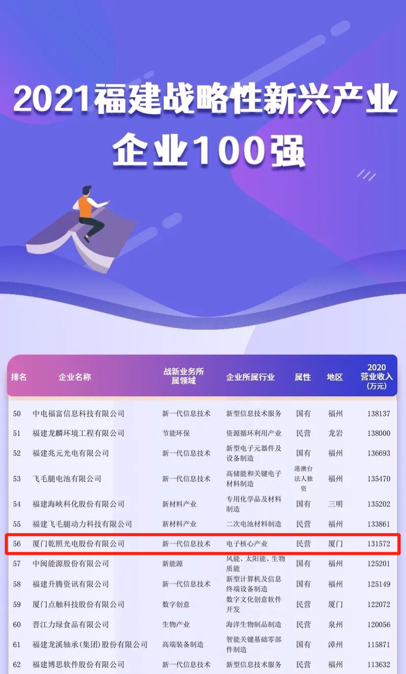 本次福建企業(yè)百強(qiáng)評選依照中國企業(yè)聯(lián)合會(huì)研究發(fā)布“中國企業(yè)500強(qiáng)”的做法要求,以2020年企業(yè)營業(yè)收入為基本標(biāo)準(zhǔn),綜合參考企業(yè)的其他經(jīng)營指標(biāo),經(jīng)評審委員會(huì)審定,廈門乾照光電股份有限公司以2020年?duì)I業(yè)收入131572萬元,入選 “2021福建戰(zhàn)略性新興產(chǎn)業(yè)企業(yè)100強(qiáng)”。