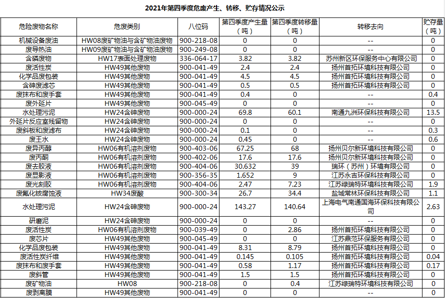 揚(yáng)州乾照光電有限公司2021年第四季度危廢產(chǎn)生、轉(zhuǎn)移、貯存情況公示