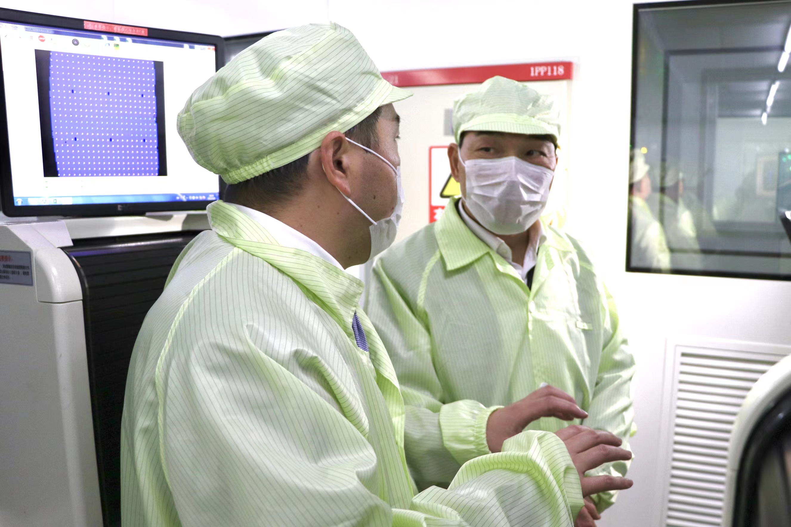在公司展廳,熊書記一行聽取了劉兆關(guān)于乾照光電發(fā)展歷程、企業(yè)文化、建設(shè)規(guī)劃、主營(yíng)產(chǎn)品及公司榮譽(yù)的匯報(bào)。熊書記圍繞企業(yè)生產(chǎn)經(jīng)營(yíng)、技術(shù)創(chuàng)新、勞動(dòng)用工等方面與劉兆進(jìn)行交流與探討。隨后,熊書記一行前往外延片、芯片生產(chǎn)車間參觀考察,認(rèn)真了解企業(yè)生產(chǎn)經(jīng)營(yíng)情況,觀摩外延片制造和芯片黃光站、蒸鍍、點(diǎn)測(cè)等車間生產(chǎn)的工藝及流程。
