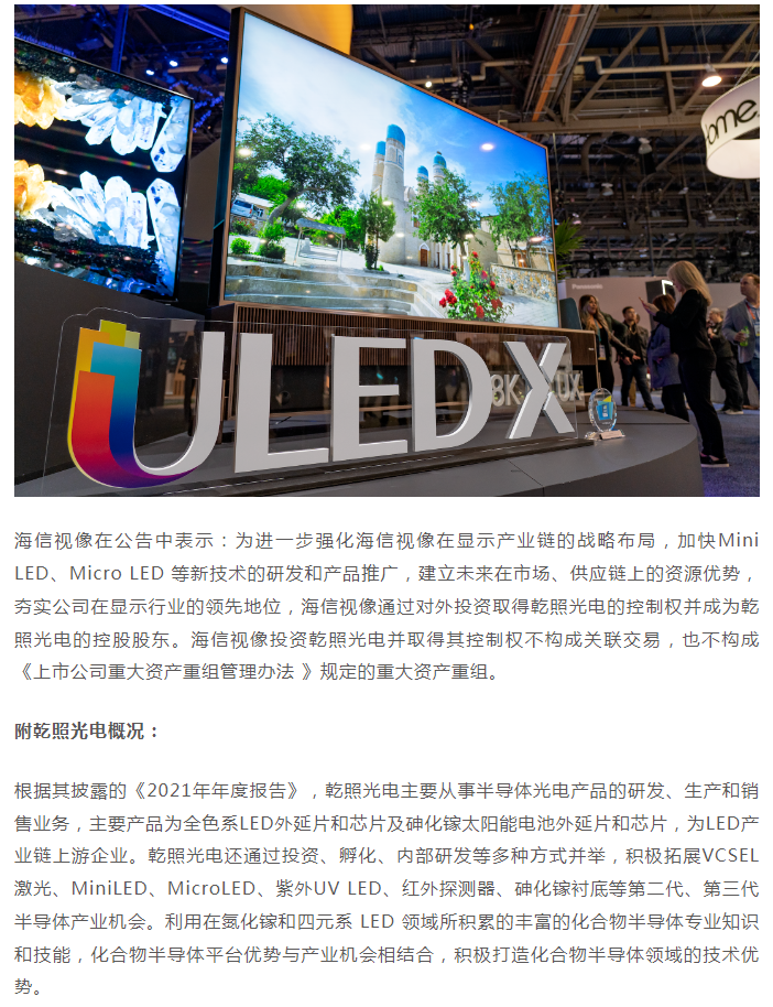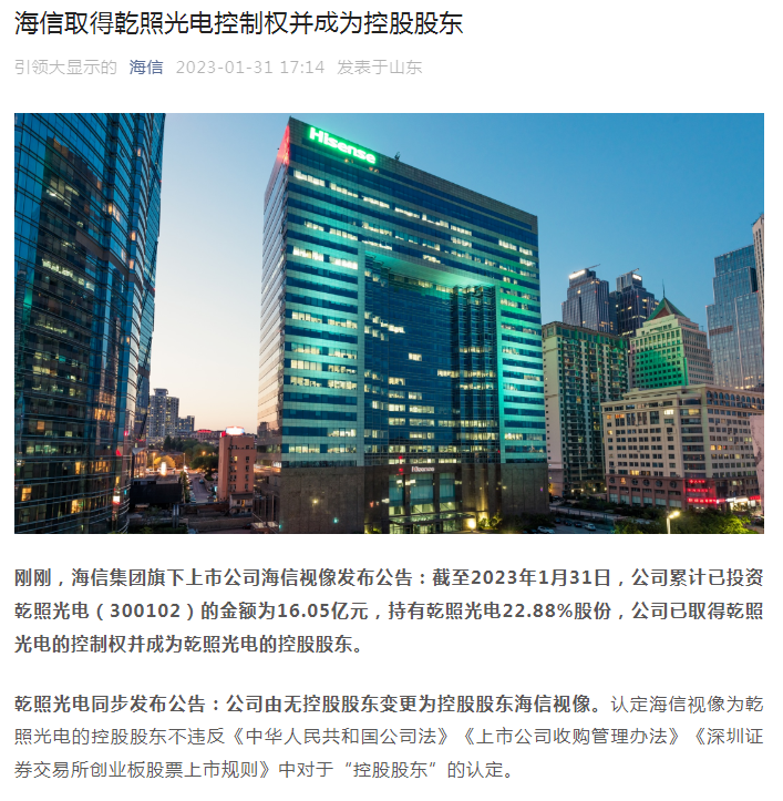 2023年1月31日,海信視像與乾照光電共同發(fā)布公告,認定海信視像為乾照光電的控股股東。