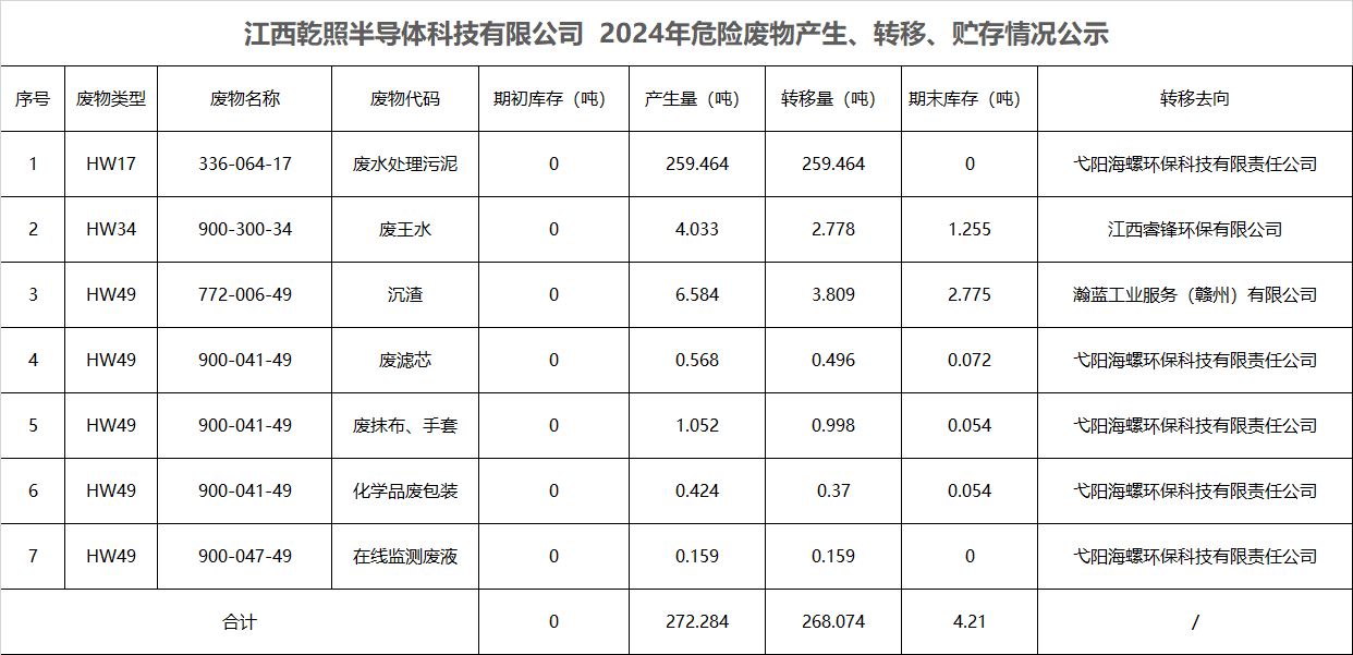 江西乾照半導(dǎo)體科技有限公司 2024年危險(xiǎn)廢物產(chǎn)生、轉(zhuǎn)移、貯存情況公示