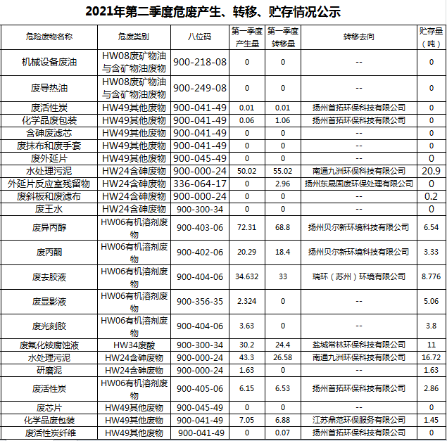 揚州乾照光電有限公司2021年第二季度危廢產(chǎn)生、轉(zhuǎn)移、貯存情況公示