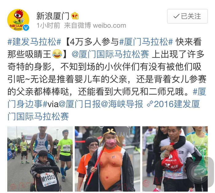 當(dāng)然,這也離不開(kāi)所有參賽選手們的齊心協(xié)助與辛苦付出。在賽道上,他們獨(dú)樹一幟,彰顯個(gè)性。在蕓蕓人海中,賺足了大眾的眼球。二師兄還上了當(dāng)日新浪廈門官方微博頭條呢。師徒仨及我司的吉祥物也被廈門網(wǎng)、廈門晚報(bào)等媒體報(bào)道啦。這不僅僅展示了參賽者的活力,更彰顯了我司的品牌魅力。