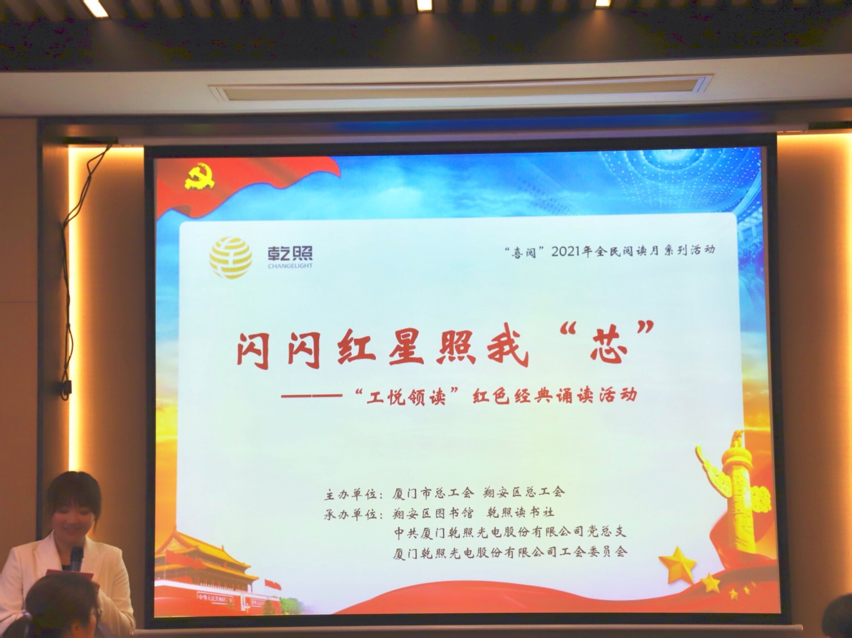 在喜迎建黨百年華誕之際,為大力繼承和發(fā)揚(yáng)黨的優(yōu)良傳統(tǒng),激發(fā)愛黨愛國熱情,進(jìn)一步團(tuán)結(jié)引領(lǐng)廣大職工堅定聽黨話、跟黨走的信念與意志。4月28日,乾照光電在廈門市總工會和翔安區(qū)總工會的指導(dǎo)下開展了主題為“閃閃紅星照我‘芯’ ”的紅色經(jīng)典誦讀活動。